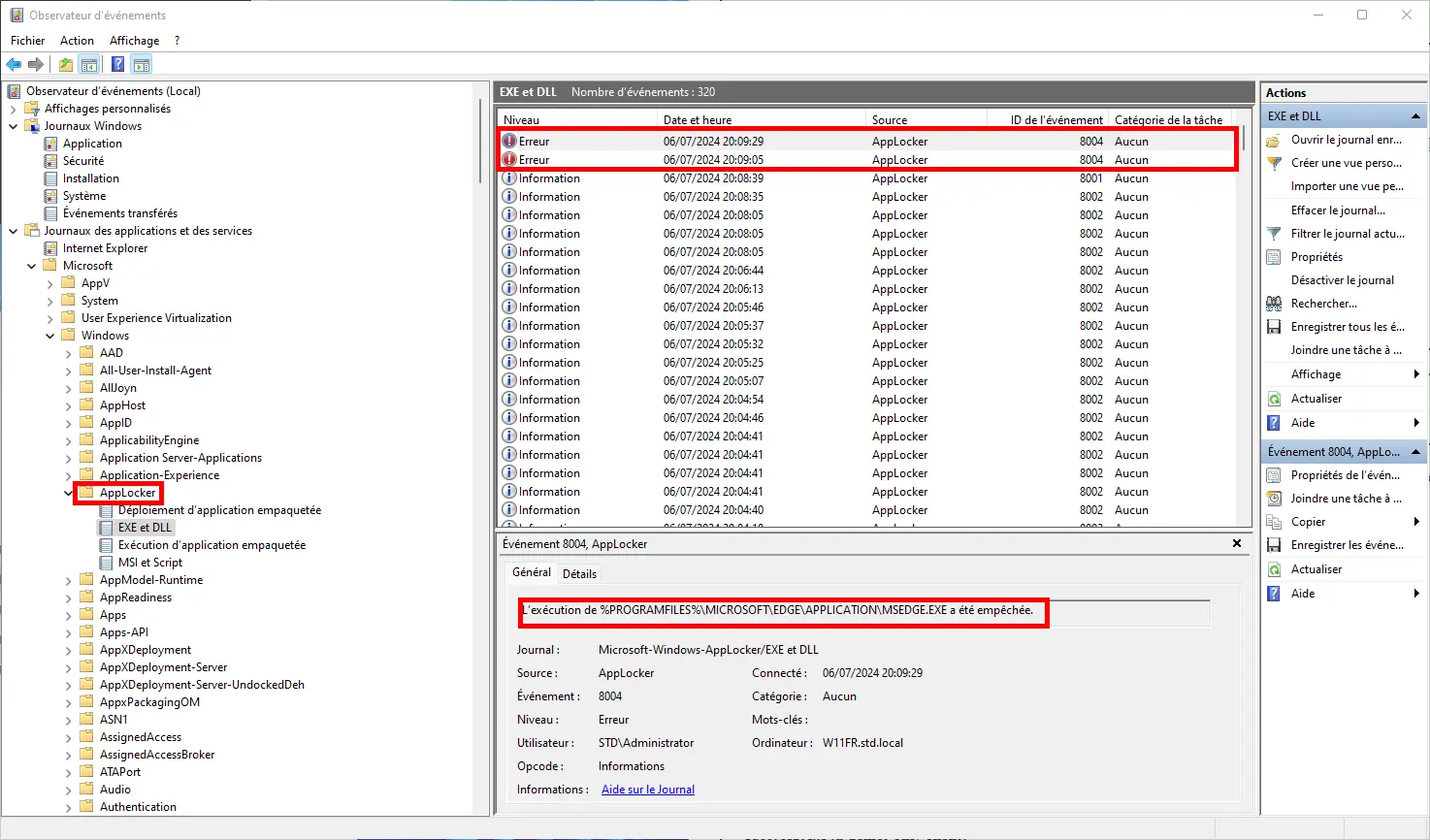 • Depuis le journal, aller dans le dossier Journaux des applications et des services> > Microsoft > AppLocker et parcourir les différents journaux pour obtenir les information sur l'application bloquée :