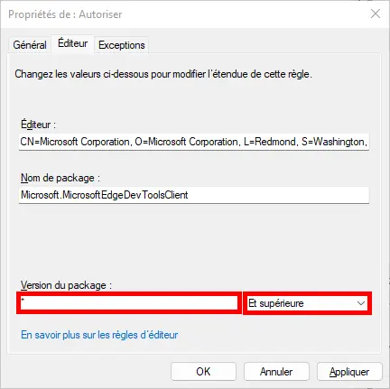 • Dans l'onglet Éditeur, vérifier que la version du package est paramétrée en * et que Et supérieure est sélectionné. Enfin, cliquer sur OK :
