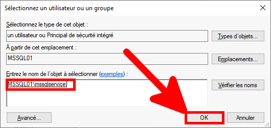 • Ajouter le compte mssqlservice et cliquer sur OK :